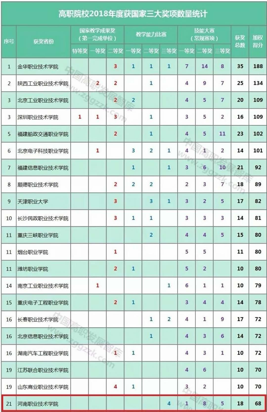 近日,教育部正式公布了2018年度最后一个年度大奖—2018年国家级教学成果奖获奖项目名单。至此,2018年高职教育国家教学成果奖、职业院校教学能力比赛、全国职业院校技能大赛三大奖项获奖名单正式尘埃落定。国家教学成果奖、职业院校教学能力比赛和全国职业院校技能大赛三大重量级奖项,代表了过去一年学校在教学改革、教学能力、人才培养质量取得的成绩,也是学校过去一年的一个成绩单。我校以18个奖项,68分总成绩综合排名位居全国高职院校第21位、全省第1位,成绩喜人。