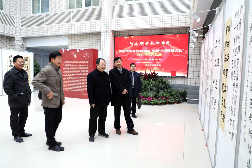 12月24日至27日,学校党委宣传部、团委和公共艺术教学部共同主办了题为“庆祝改革开放40周年 弘扬中华传统文化”师生书法作品展活动。共展出师生书法作品50件,为庆祝改革开放40周年,弘扬中华传统文化营造了良好的氛围。展览期间,前来我校调研的河南省教育厅思政处处长李培俊,在学校党委书记李四清、院长李桂贞和有关单位负责人的陪同下,观看了师生书法作品 。