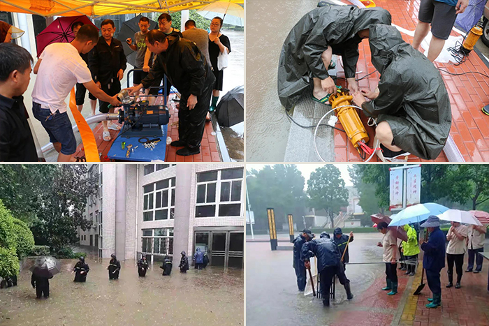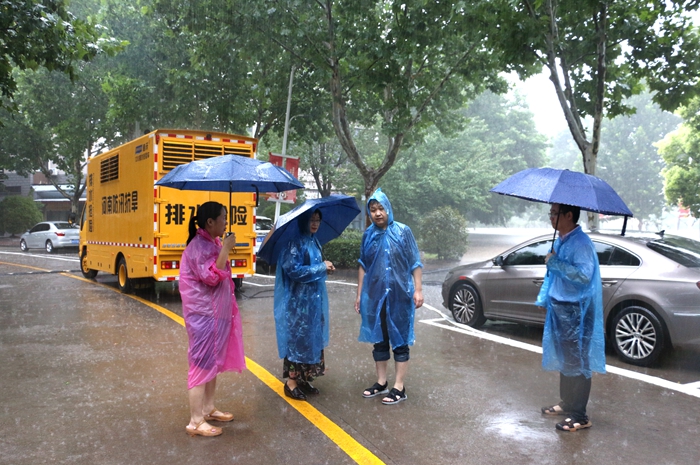 7月20日下午,应学校求助,省水利厅安排防汛抗旱物资储备中心副主任曹长江等一行4名专业人员,配备1台应急排水抢险车和3套大功率排涝设备,冒着特大暴雨,不分昼夜守护现场,协助我校开展排涝抢险。