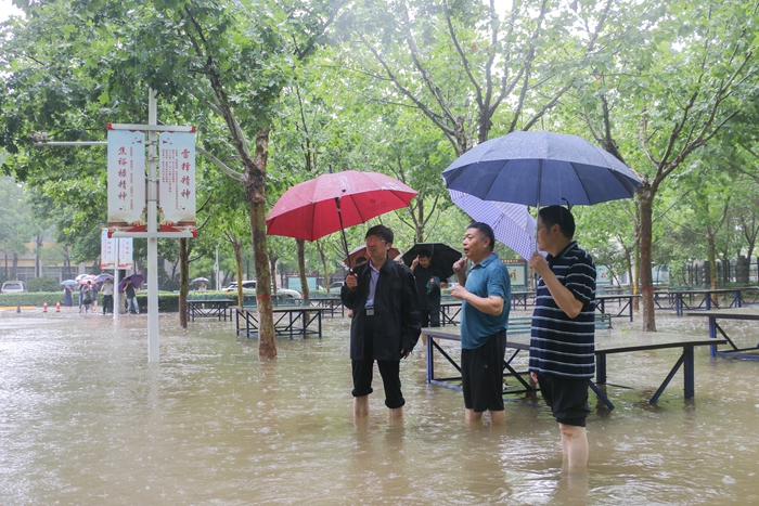 汛情严峻,刻不容缓。随着特大暴雨持续不停,校外积水顺着校园周始路西侧冲到校园,明湖水面快速上涨,明湖广场、周始路东侧至学校东门路面积水达到50cm以上,校园洪涝险情严重。学校防汛抗洪救灾应急指挥领导小组密切关注险情。7月21日,省水利厅领导亲临现场巡查指导积水排涝工作。学校党委第一时间安排部署防汛减灾工作,值班领导连夜组织带队巡查校园各项安全保障措施,全体中层干部随时待命。同时,宣传部还通过学校官方微信公众号及时推送暴雨自救指南,为广大师生科普暴雨自救知识。