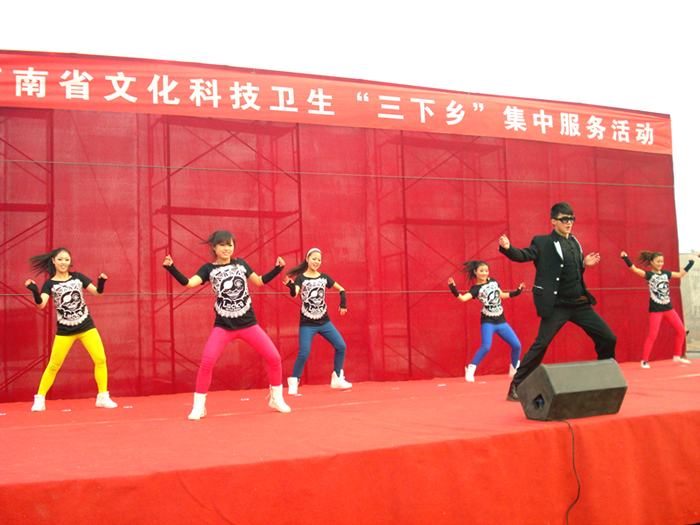 此次“三下乡”集中服务活动演出由中共河南省委宣传部、河南省文化厅主办,河南省群众艺术馆承办,是“三下乡”整体活动的重要组成部分,旨在为农村广大群众送去精彩的节目,丰富农村业余文化生活。音乐学院学生冒着严寒为广大农村观众送上了热情洋溢的舞蹈表演《江南style》,收到群众的一致好评。表演结束后,河南省委常委、宣传部部长赵素平等领导亲切接见了参加表演的学生。