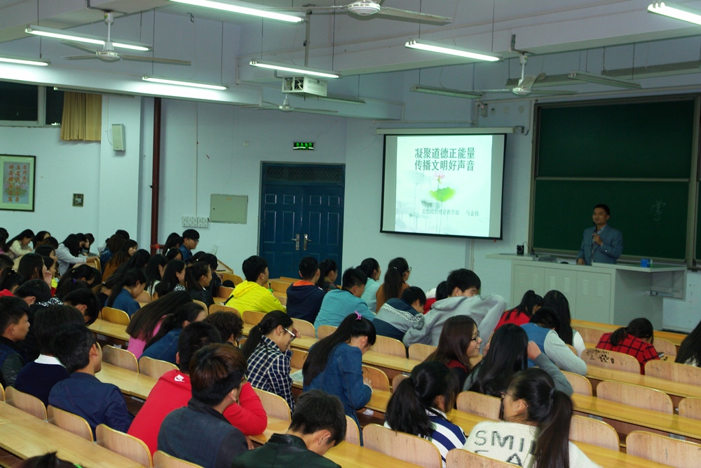 聆听名师讲座,提升道德文明水准。10月29日晚,宣传部邀请思想政治理论教学部马金伟老师,为工商管理系300多名学生作了道德文明专题讲座。
