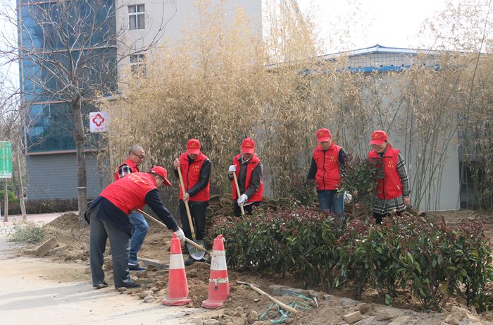 活动现场,在技术人员的指导下,大家干劲十足,铲土、挖坑、培土、踩实,严格按照工序,认真细致地种下一棵棵绿树。经过1个多小时劳作,在学校医务室周围栽植绿植20余棵,为校园增添了绿意。