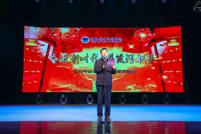 晚会在优美的《喜迎新春》舞蹈中拉开帷幕。表演团队舒展着轻快的动作,彰显了师生员工健康快乐的心情。随后,校党委书记李四清发表了热情洋溢的2020新年贺词。他向所有长期支持和帮助学校事业发展的各级领导、社会各界朋友表示衷心的感谢,向全体师生、离退休老同志、广大校友,致以诚挚的节日问候和新年祝福。他指出,学校坚守初心,高质量推动党建工作,坚持立德树人,办学条件不断完善,持之以恒民生得到改善,教学质量不断提高,就业创业成果纷呈,校园文化特色鲜明,深化开放合作办学,服务社会赢得赞誉。2019年学校实现了新突破和新提升,学校入选“双高计划”高职院校建设单位、戏曲资源库正式入选国家级教学资源库、“双师型”教师队伍建设入选教育部典型案例、入选“全国职业院校精准扶贫协作联盟”常务理事单位,学校被认定为河南省智能制造公共实训基地和国家级高技能人才培训基地,学校获国家教学能力大赛一、二等奖,实现了重大突破,学校师生在全国职业院校技能大赛中获13项奖项,成绩位居全省前列。