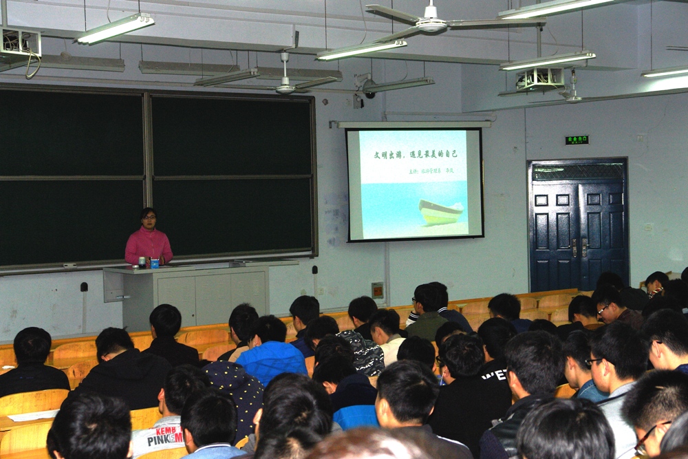 人文道德大讲堂,师生身心大健康。由宣传部主办、各系(院、校)协办的2016年上半年人文道德大讲堂于3月24晚拉开帷幕。旅游管理系副主任李岚为汽车工程系250余名师生作了题为“让我们文明出游”的专题讲座,获得听讲师生的一致好评。