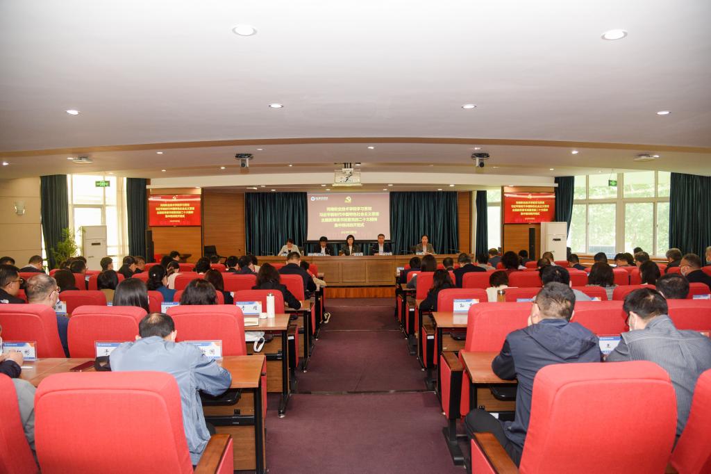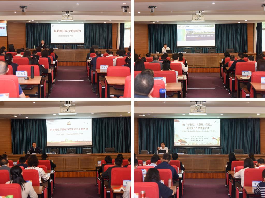 在专家报告环节,中国高等教育学会职业教育分会理事长周建松,全国知名职业教育专家董刚,河南省社会科学院党委副书记、院长王承哲,省委宣讲团成员、南阳农业职业学院校长孔国庆分别作题为《全面提升学校办学关键能力》《高职教育高质量发展与“双高计划”实施及思考》《学习习近平著作与马克思主义世界观》《做“有德性、有思路、有能力、能担重任”的栋梁之才——品习近平新时代中国特色社会主义思想的干部哲学》的报告,四位专家分别围绕学校办学关键能力提升、 “双高计划”实施及思考、习近平著作与马克思主义世界观、做“有德性、有思路、有能力、能担重任” 的栋梁之材等内容进行专题辅导。