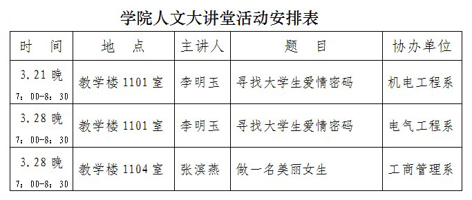 经过两个多月的充分准备,学院人文大讲堂将于本周四正式开讲。现将本周四及下周四的讲座安排如下(见附表)。届时欢迎学院领导、各单位领导及广大师生前去听讲。